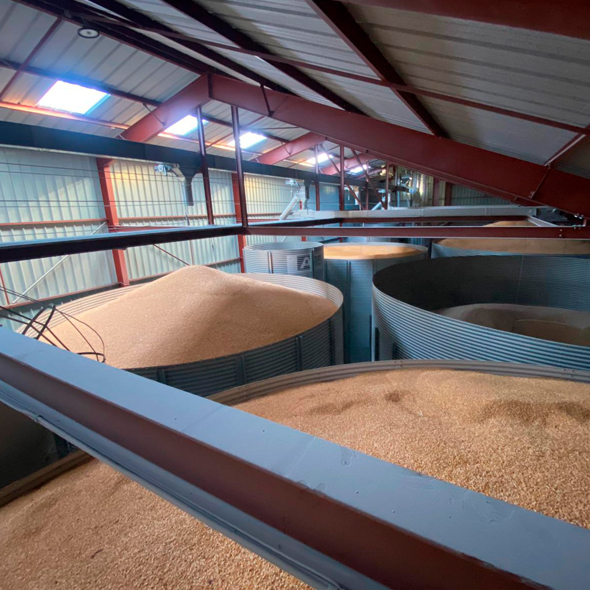 - 5 silos intérieurs à fond plat pour céréales : 3 x 480 T et 2 x 320 T unitaire